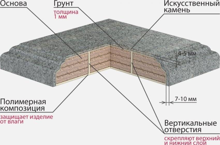 Его твёрдость ниже, чем у литого камня. Причиной этому служит меньшее количество используемых минеральных наполнителей. Из смеси изготавливают изделия сложной формы. При производстве используют 2 вида состава. Они отличаются компонентами и процентным содержанием наполнителя.