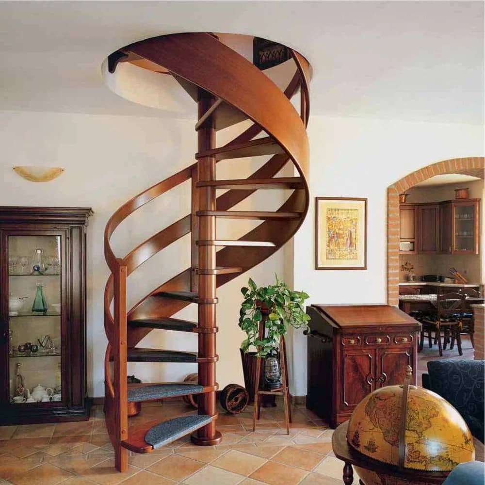 Конструкции винтового типа применяются реже, как правило, при ограниченной площади или из эстетических соображений владельца частного дома. Они не так удобны, как маршевые, по ним сложно транспортировать мебель. Чтобы установить лестницу, нужно будет выполнить сложные подсчеты, так как при небольшой погрешности она может утратить свои функциональные способности.
