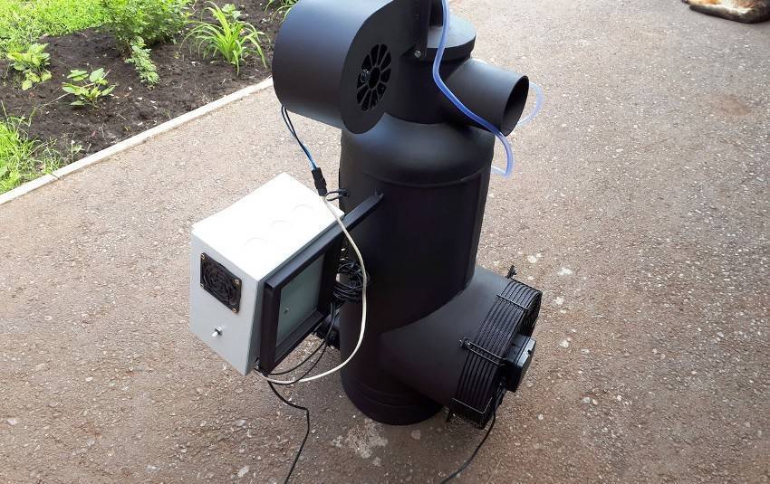 В центре свободного пространства устанавливается камера сгорания, для которой можно использовать оцинкованную трубу. С двух сторон отсек запаивается, после чего в нем проделываются отверстия для форсунки и дымоотвода. Камера сгорания прочно фиксируется к стенкам корпуса. Рабочий отсек желательно оснастить пьезорозжигом, а также подсоединить к нему вентилятор.