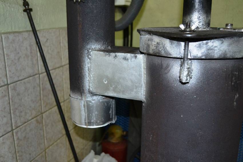 Нижняя часть крепится ко второй камере с помощью трубы с отверстиями для воздуха. Наверху оборудуется дымоход. Для работы конструкции на дровах потребуется извлечь емкость для отработки и закрыть вьюшку с трубой. Для топки маслом предусматривается другая технология.