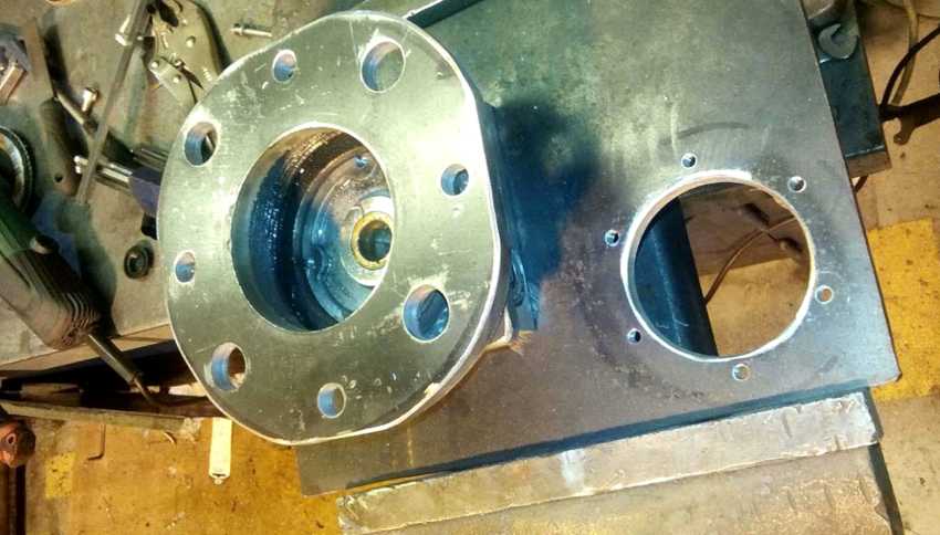 Фланец можно выполнить из автомобильной ступицы, обработав его на токарном станке. В металлической плите для установки гидроцилиндра нужно приварить круглую бобышку для фиксирования токарного станка в патроне. После растачивания отверстия плита приваривается к основанию рамы.