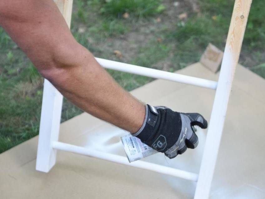 После того, каклестницасобрана, можно приступать к ее покраске. Секретов здесь практически нет никаких. Нужно пройтись равномерно кистью с краской по всей поверхности изделия. Если через первый слой просвечивается древесина, то покрасить второй раз. Но делать это нужно, когда полностью просохнет первый слой. И еще один нюанс: чтобы краска не забивала шлицы в головке саморезов, их нужно немного выкрутить до покраски, а когда краска высохнет закрутить на место.