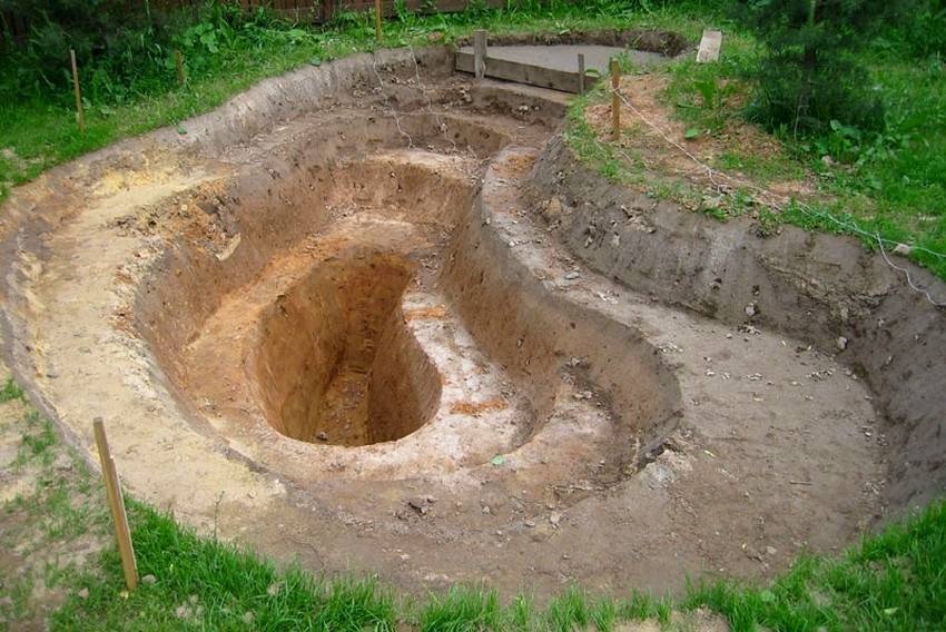 Для построения рельефа эксперты рекомендуют применить ступенчатый метод. Его суть заключается в том, что мелкую часть нужно сделать не глубже 40 см, а глубокую-110-150 см