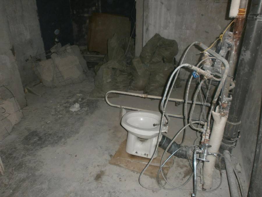 Последним демонтируем унитаз. Он был подключен к чугунному колену, которое вставлено в канализационный стояк. Чтобы вынуть это колено – пришлось помучиться. Делали раньше на совесть. Но против кувалды и лома всё-таки нет приёма. Только постукивать по колену нужно аккуратно, чугун – материал хрупкий. Постучали, покрутили – вынули.