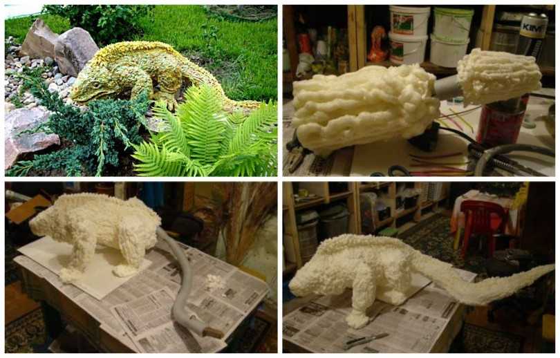 Фигуры из монтажной пены можно сделать своими руками. Они оригинально смотрятся на любых садовых участках. Их изготавливают на основе массивного каркаса, который делает их устойчивыми к порывам ветра.
