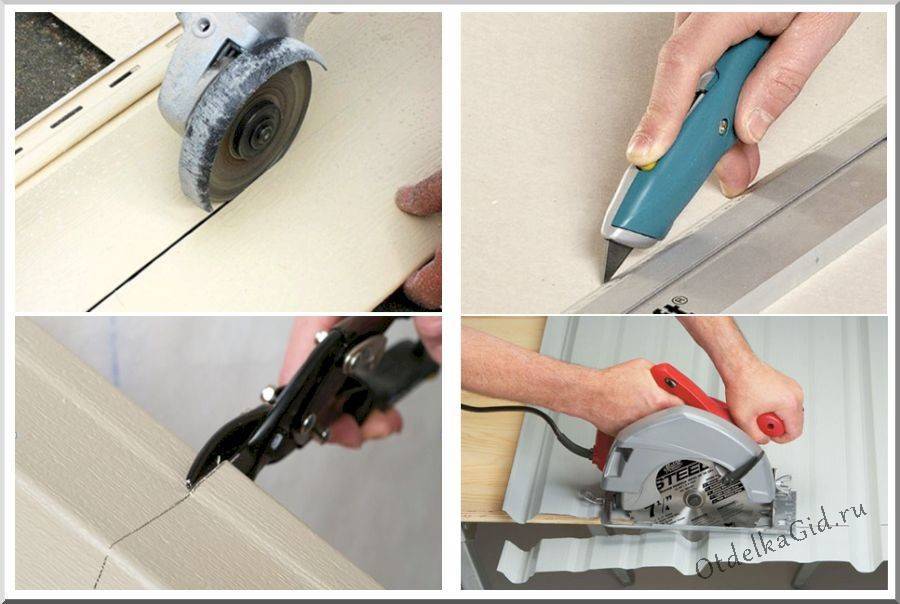 Винил и акрил режется любым инструментом, металл только ножницами или циркулярной пилой, для фиброцемента используется болгарка, а дерево режут ножовкой или циркуляркой (резать деревянный сайдинг болгаркой категорически запрещено)