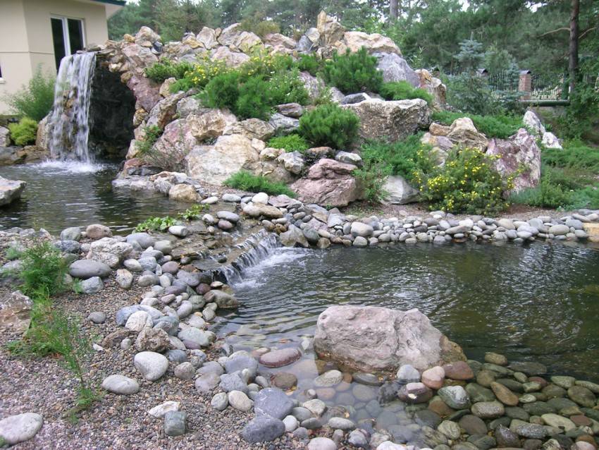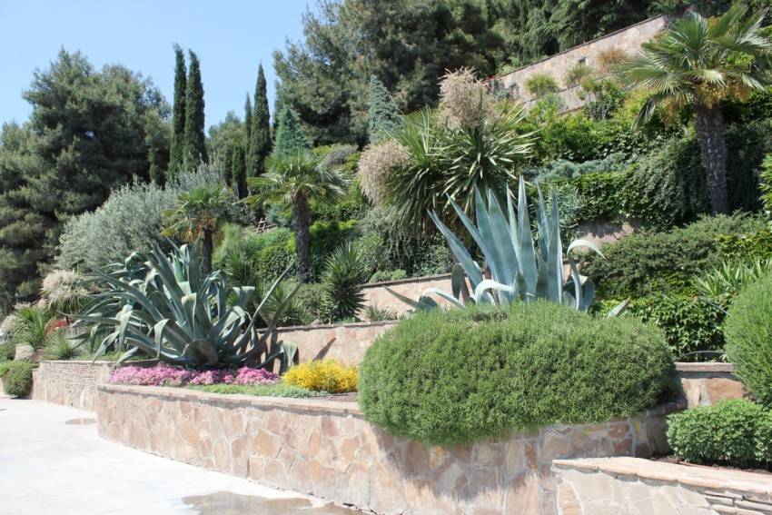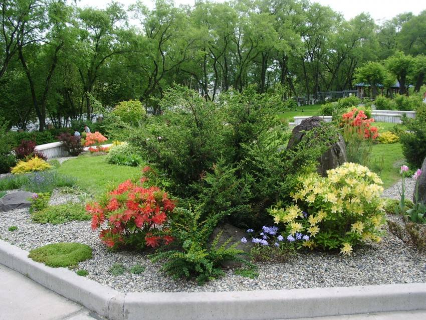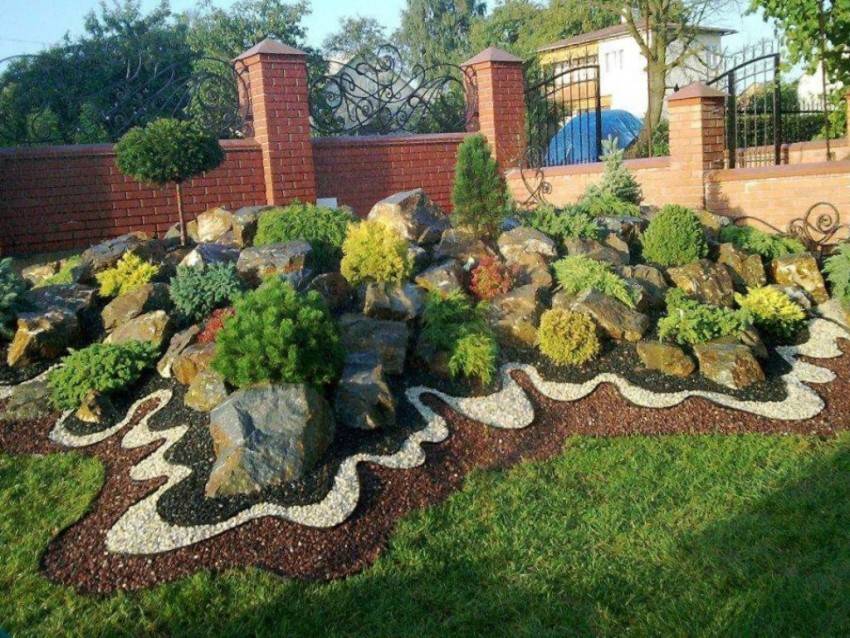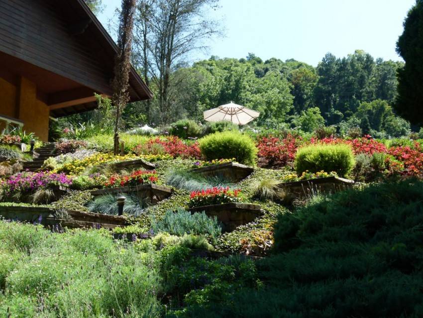 - В нижней точке стараются высаживать высокорослые культуры. Они помогают сгладить перепад высот.