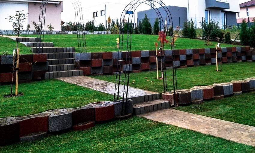Подобную лестницу на склоне можно сделать из строительных блоков.