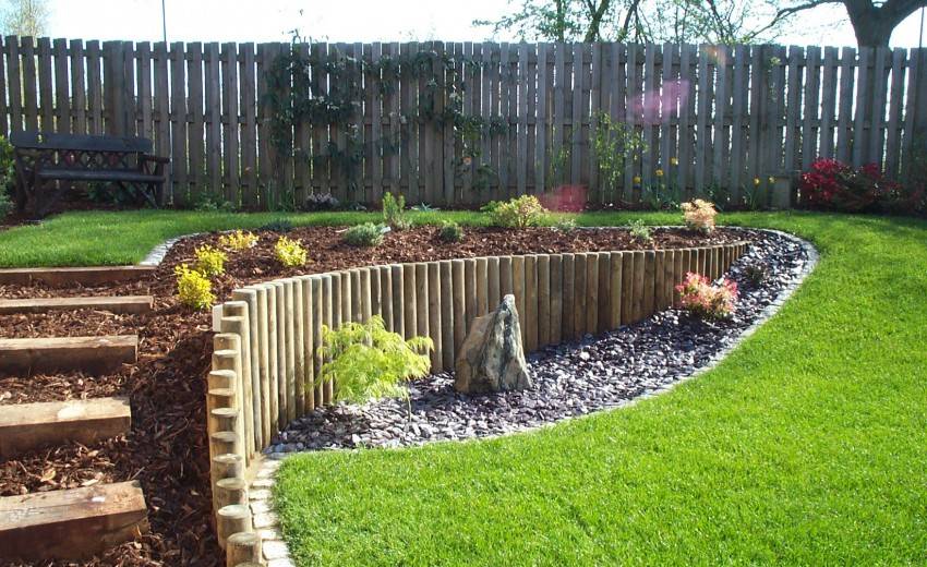 - Ограждение из брусьев, штакетника можно использовать для забора, который повторяет небольшую возвышенность участка.