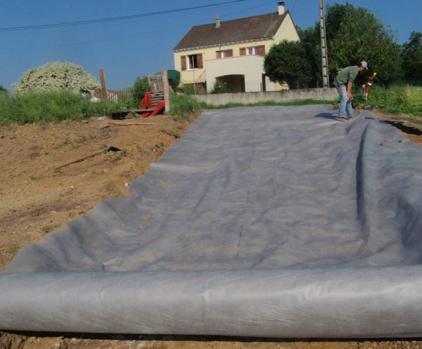 Начинаем подготовку к укладке бетона. Так как грунт – суглинок, необходимо выстелить геотекстиль с запасом на откос, и щебнем отсыпать подушку.