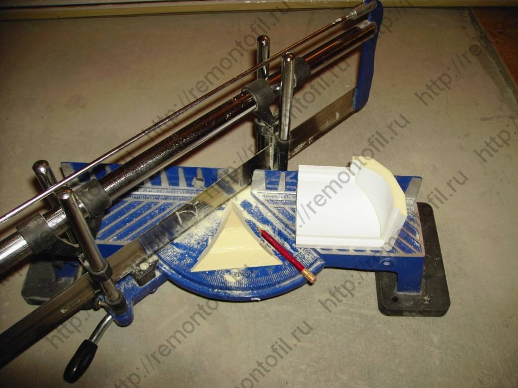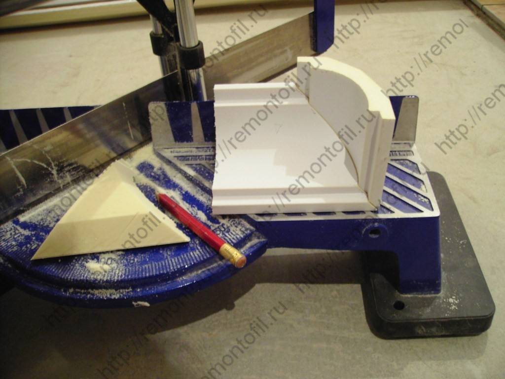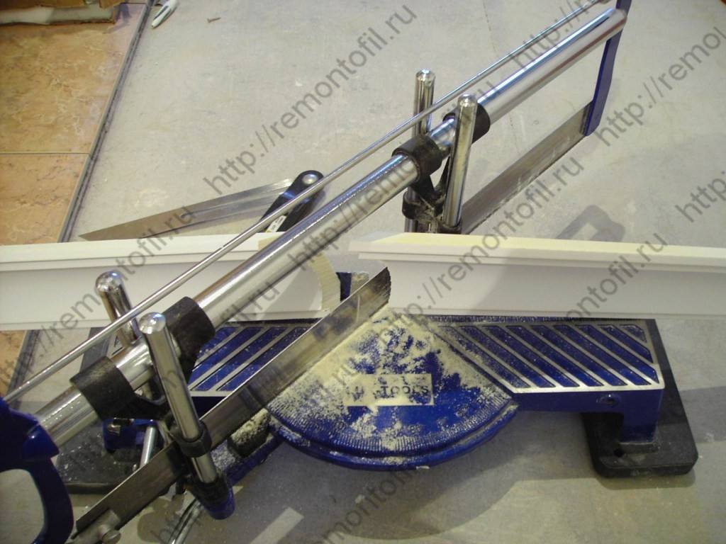 При монтаже угловых стыков плинтуса на потолке необходима точная отрезка панелей. Пенопласт является довольно мягким материалом, потому для этого можно использовать и остро заточенный нож. Но если вы хотите добиться высокой точности реза, то лучше проводить отрезку на стусле.