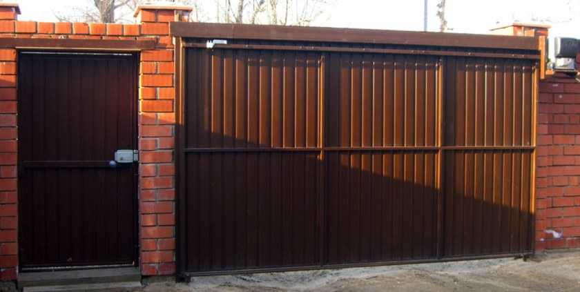 Наибольшей популярностью среди частных застройщиков пользуются распашные ворота. Створки могут открываться как в одну, так и в обе стороны. В качестве материала, который крепится к каркасу, используют профнастил. Также в полотне ворот можно сделать калитку.