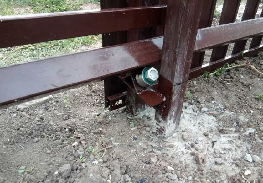 Опорные столбы могут быть просто забыты в землю или забетонированы. Во втором случае опоры окажутся намного прочнее и надежнее. Также не стоит забывать о необходимости правильной установки петель. При забивании необходимо погрузить опоры в грунт на 130 см.