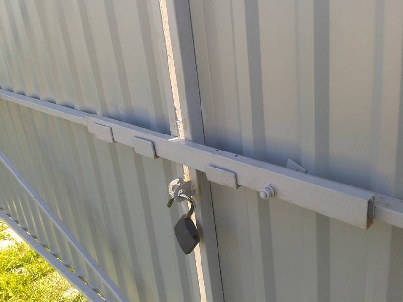 На створках делаются три захвата. Один — на той же створке, где крепится засов, рядом с торцом ворот. Второй — напротив него, возле торца второй створки, и третий — вблизи дальнего конца засова. При необходимости в нем могут быть сделаны проушины для навесного замка.