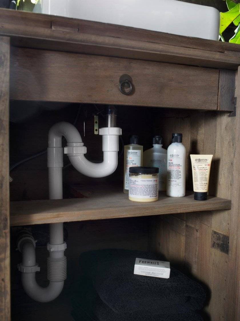 Можно соорудить конструкции, похожие со шкафчиками для ванн, в которых будут спрятаны трубы и их не нужно монтировать в стену. Эти шкафы используются частично скрытия для труб и частично для хранения хозяйственных мелочей.