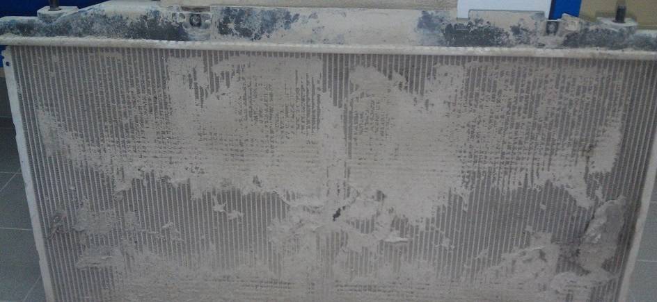 Некорректная работа системы кондиционирования автомобиля связана также с неполадками в радиаторе устройства. Причина этому одна – повреждение алюминиевой оболочки, что может привести, в свою очередь к утечке хладагента.