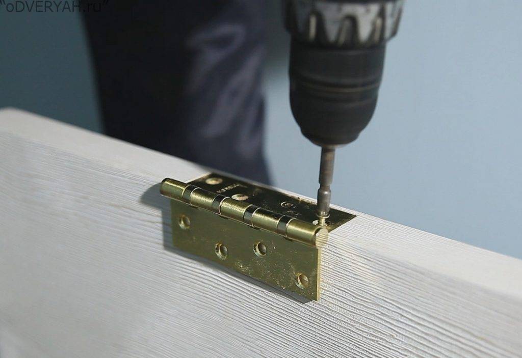 При навешивании межкомнатной двери можно применять и ввертные петли. Их крепление происходит за счет штырей, под которые сверлят отверстия с диаметром меньше толщины штыря с резьбой. Части петель вкручивают в полотно и коробку.