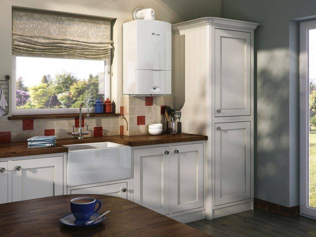 Обязательно должна быть хорошая вентиляция, надо предусмотреть место для прокладки коммуникаций, дымохода. Все боковые поверхности, которые будут примыкать непосредственно к газовому котлу, должны быть изготовлены из негорючих материалов. Обычно стены кухни покрываются кафелем. Если прятать колонку между двумя навесными шкафчиками, то надо предусмотреть, чтобы по бокам они имели специальное покрытие, не столь восприимчивое к высоким температурам.