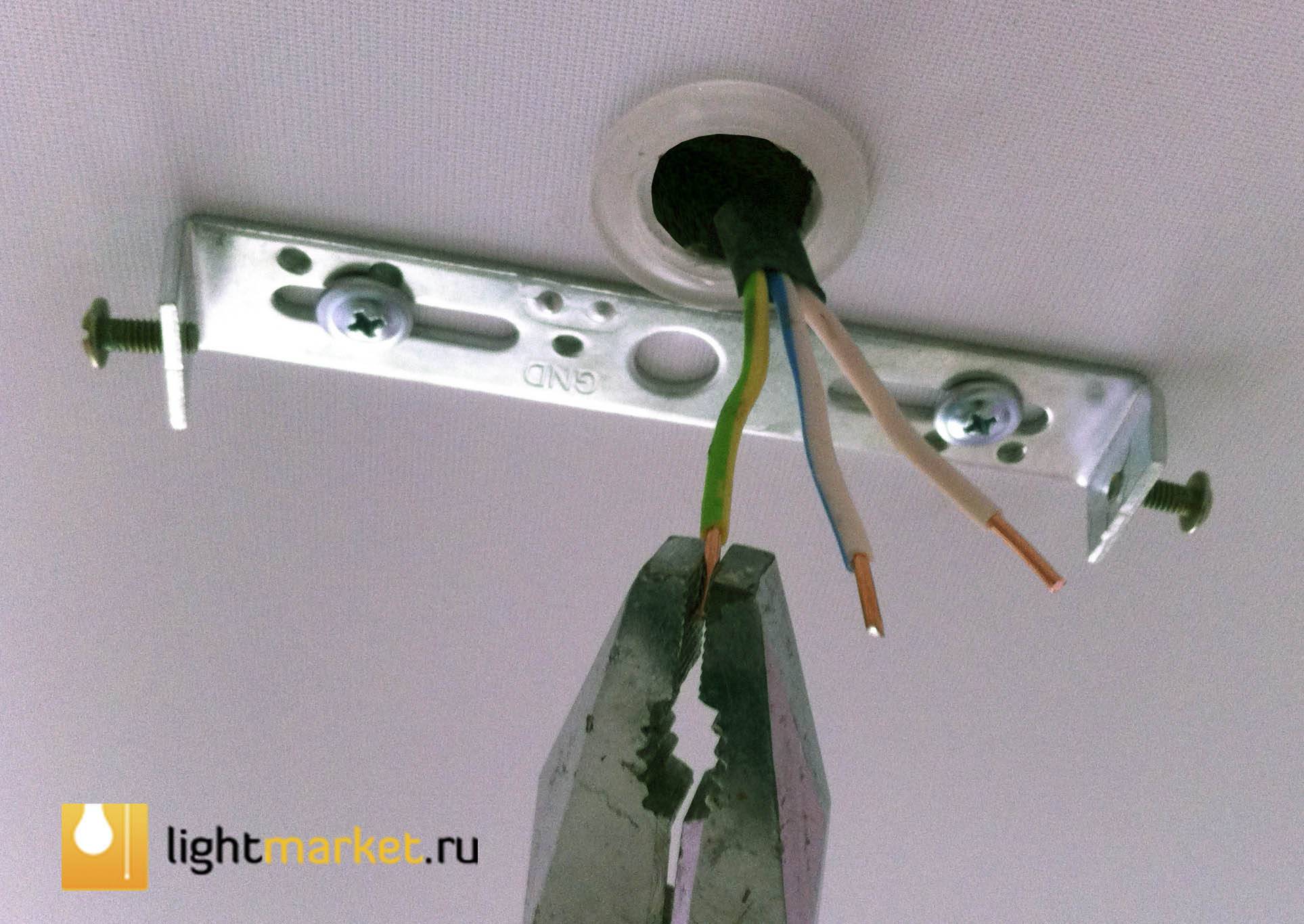 Когда подготовлены крепежи, люстру нужно подсоединить к сети. Посредством предварительно сделанного отверстия через термокольцо протягивают наружу провода. Светильник подвешивают на планку или крюк, чтобы освободить руки, и подключают проводку.