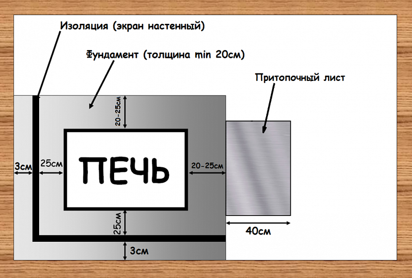 - Независимо от того, какая схема установки печки выбрана, требуется соблюдать нормативы относительно расстояния от печи до конструкций.