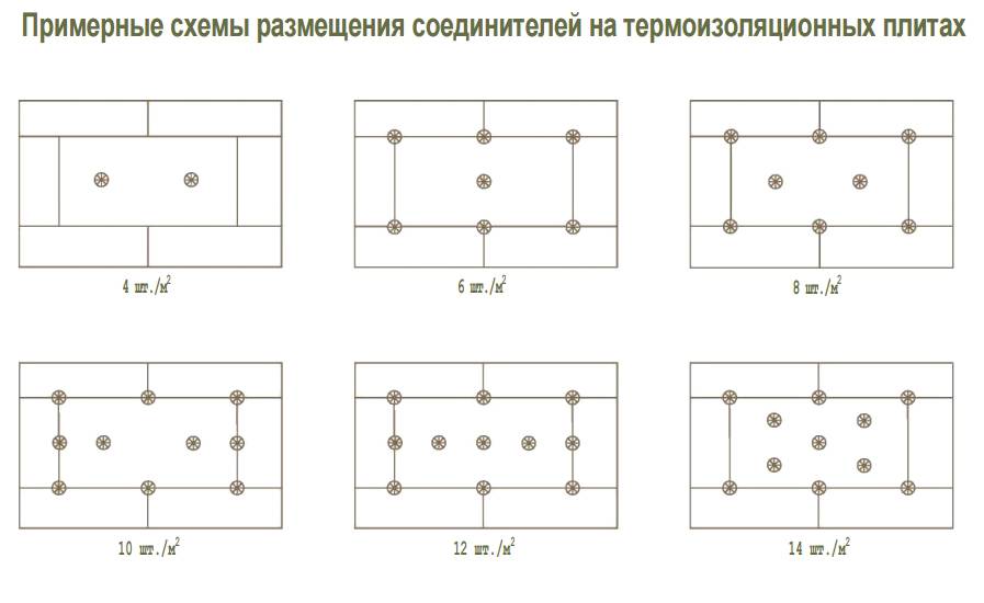 Количество дюбелей для пенопласта от 4 до 6 шт./м². При определении длины дюбелей нужно учитывать толщину старой штукатурки, слой клея и толщину термоизоляционного материала. Следует иметь в виду, что, несмотря на несущую способность основания в случае зданий высотой более 20 м следует в обязательном порядке применять механические соединения. Краевые зоны здания, где возникают наибольшие силы, вызванные ветром, т. е. от 1 до 2 м от края, проект утепления должен предусматривать увеличенное количество дюбелей в данных местах.