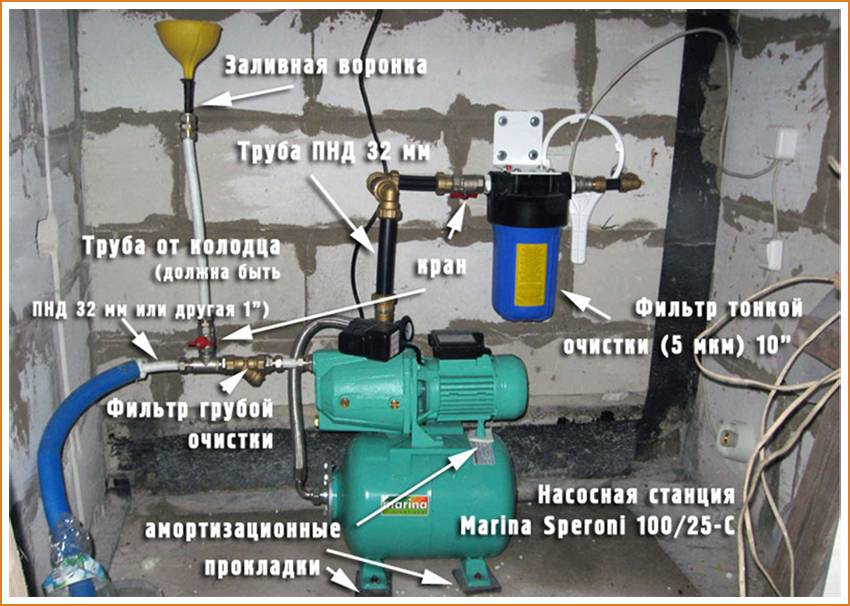 Детальная схема обвязки насосной станции при подключении к колодцу или скважине