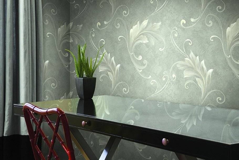 Белые или пастельные полотна на стенах могут иметь некоторый орнамент или плавные рисунки. Например, для шикарных помещений с интерьером классик подойдут полотна, с изображенными на них вензелями, выполненными в виде структурных серебристых элементов. Такие полотна станут достойным фоном для изящной мебели светлого тона.