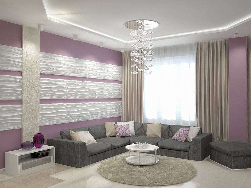 С подобным фоном есть возможность поиграть с расцветками: добавить немного салатового или розового, сделать акценты на предметах мебели (в виде накидок или пледов). Помните, что сиреневый тон должен гармонировать с полупрозрачным тюлем. Это одно из важных условий в решении вопроса, как выбрать обои в гостиную и с помощью них обустроить в ней уют.