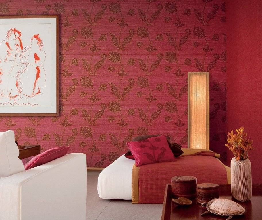 Для индийского стиля характерны виниловые фактурные полотна с тематическим орнаментом, а также стены, имитирующие дорогие ткани.