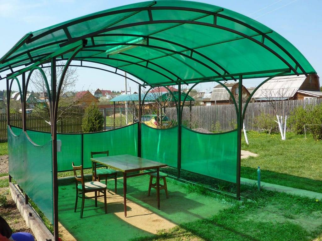 - Что касается цветовой гаммы, то лучше применять панели, окрашенные в синий, зеленый или бронзовый цвет. Полностью прозрачные листы хороши для теплиц, а вот в беседке они будут давать недостаточно тени.