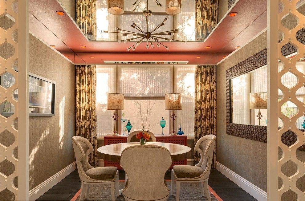Совсем не обязательно создавать сплошной зеркальный потолок, обычно достаточно разместить на потолке зеркальное панно. Такой декор можно использовать для разделения помещения на зоны. Создание потолка из зеркала существенно упростилось с появлением на рынке специальных резных плиток. Также существуют реечные отражающие потолки, которые делаются из пластика или алюминия и покрываются специальным напылением. Зеркальным может быть и обычный натяжной потолок.