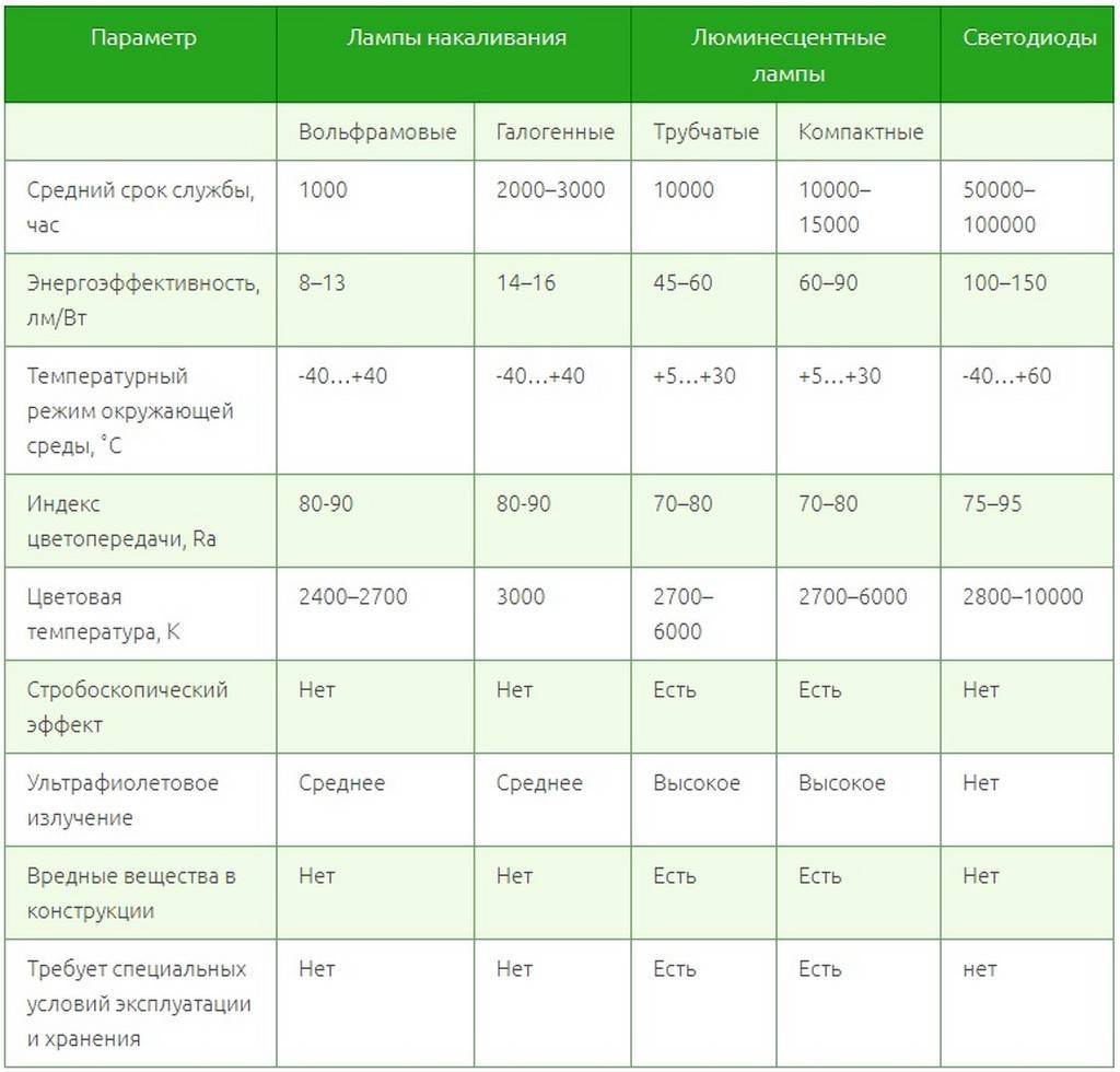 Таблица соответствия энергоэффективности ламп накаливания, энергосберегающих светодиодных и люминесцентных ламп