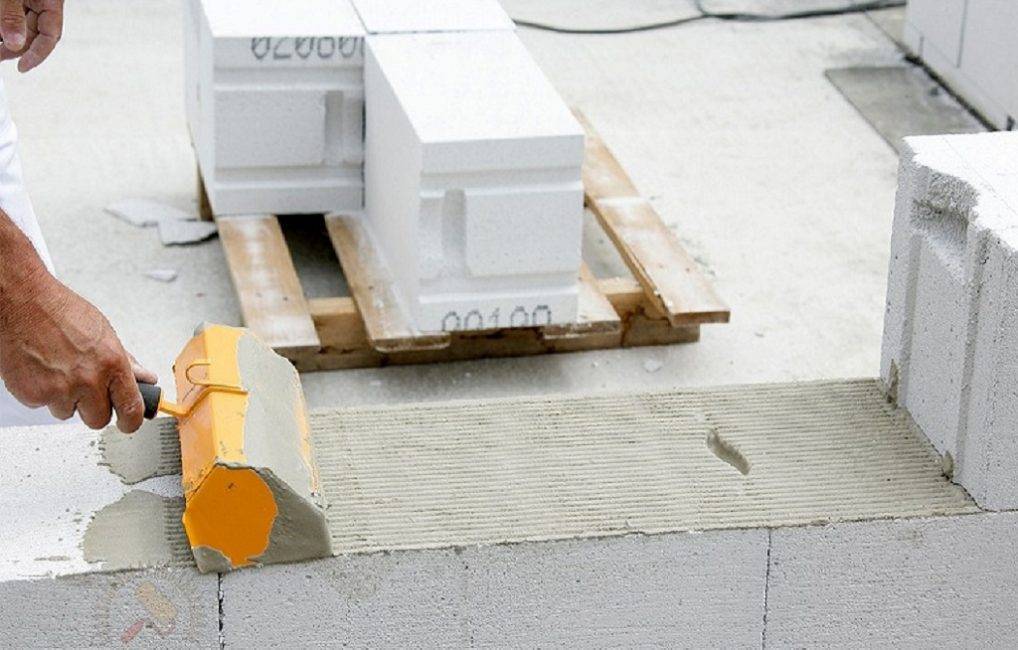 - Для укладки блоков из газобетона и газосиликата применяется специальная клеевая смесь, в которой, кроме цемента и песка имеются добавки, улучшающие адгезию и ускоряющие схватывание вяжущего раствора;