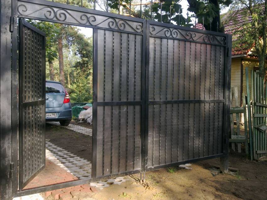 Створки из поликарбоната комбинируют с различными материалами. Это обосновано низкой прочностью полотен. Чаще используются кованые элементы, алюминиевая или деревянная окантовка.