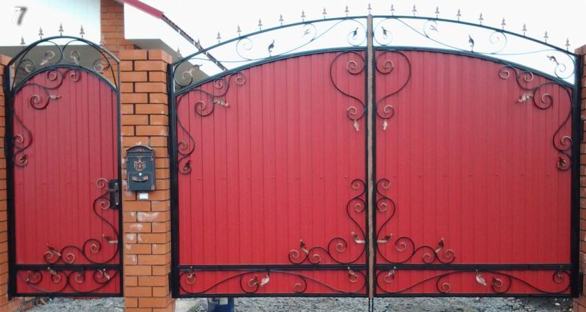 Калитка из профнастила хороша не только доступностью материала, быстротой и технологичностью изготовления, но и тем, что гофрированный стальной лист придает полотну дополнительную прочность. Считается, что заборы из профлиста вид имеют утилитарный. Однако и ворота с калиткой из профнастила можно различными спобобами облагородить, см. далее.