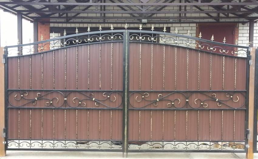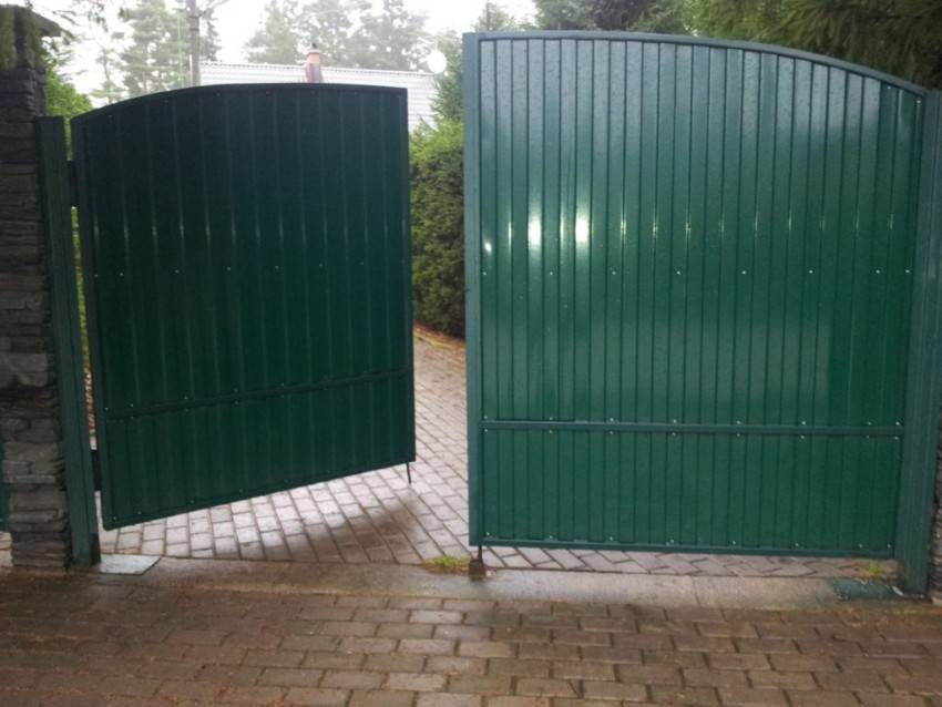 Универсальное решение, створки крепятся на навесных петлях, если дверцы тяжелые, используется подшипниковая фурнитура. Одна дверца может быть шире другой. Среди преимуществ распашных моделей — невысокая цена за квадратный метр и простой монтаж. Рекомендуемая ширина для проезда транспортных средств — 3,5–4 м, высота — не менее 2 м.