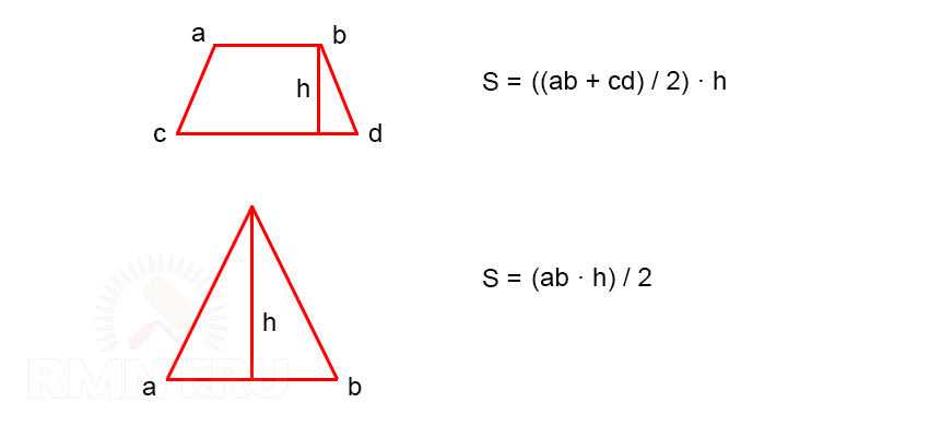 Этот расчёт сводится к определению площадей трапеции (ската) и треугольника (вальмы).