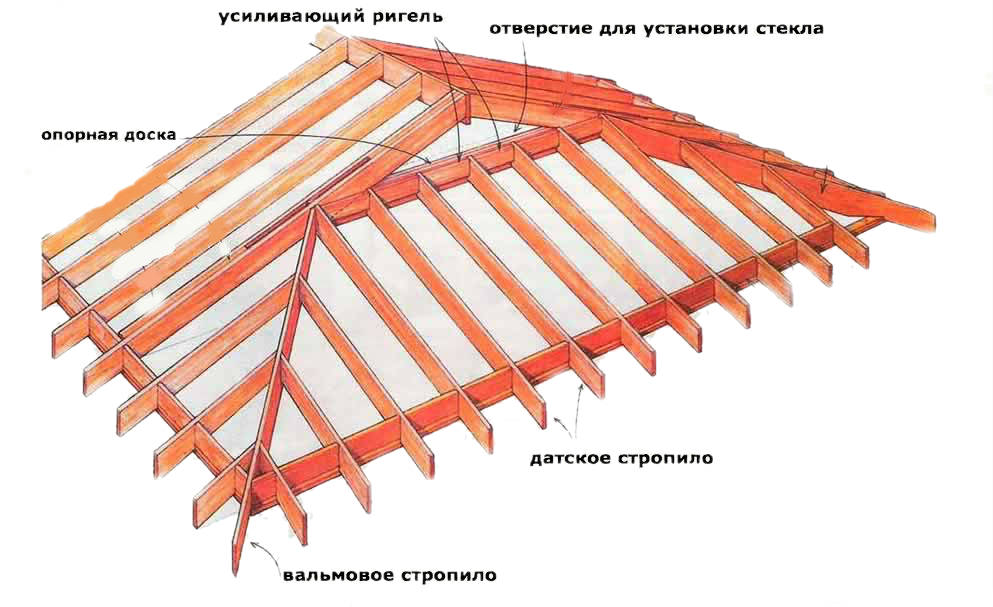 Несмотря на разнообразие типов крыш, их конструкция состоит из одних и тех же элементов стропильной системы. Для крыш вальмового типа: