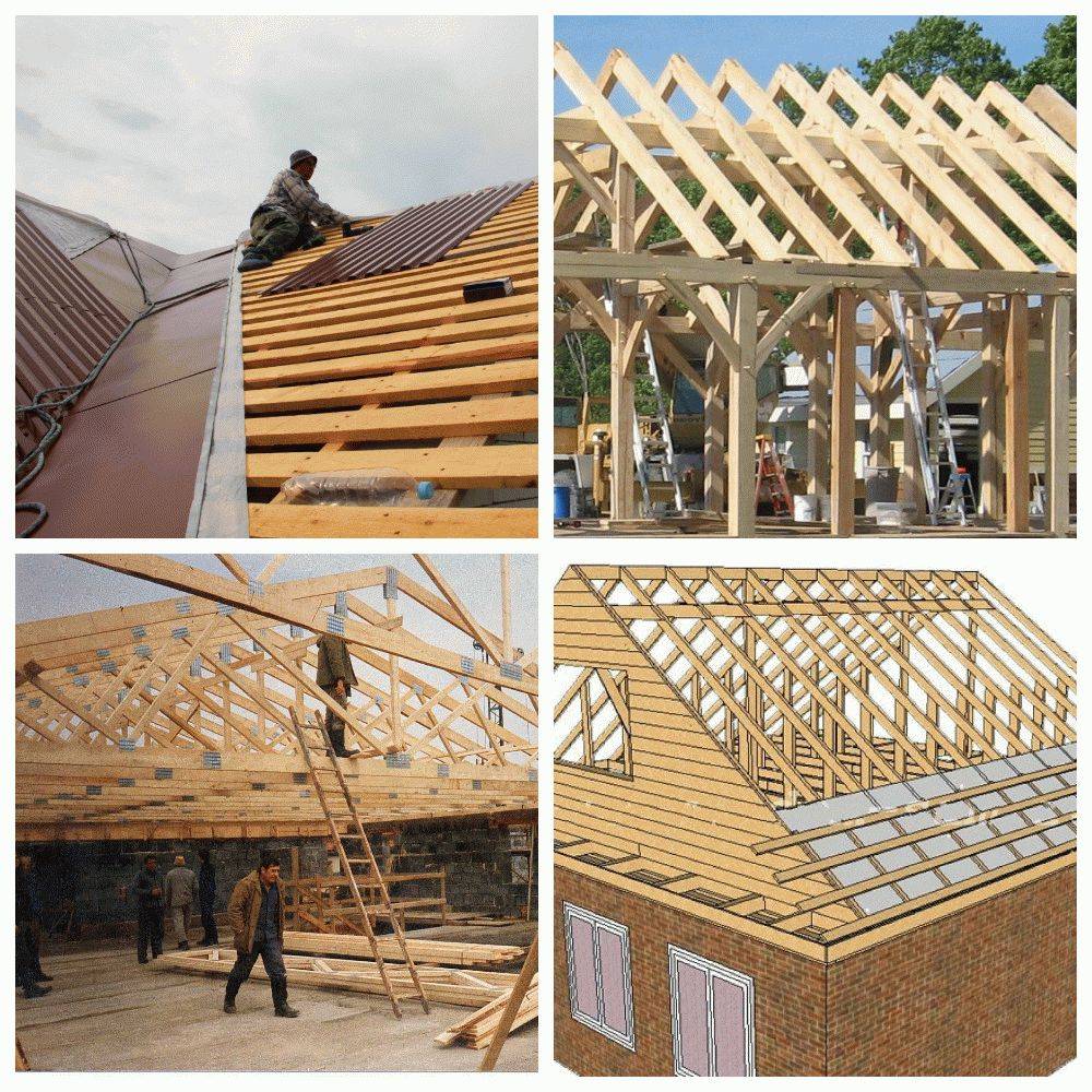 В основе конструкции обязательно присутствует мауэрлат (мощный брус или бревно), сбитый в цельную раму по форме основания и уложенный поверх армопояса. Вся система стропил привязана к мауэрлату. Выглядит она как четыре наклонных бруса сечением 50 на 100 мм, скреплённых в центре крыши (размер бруса зависит от габаритов и веса будущей кровли). Если дом сложен из камня или кирпича, в качестве мауэрлата выступает верхняя обвязка стеновой панели, в деревянных постройках — верхний венец сруба. Мауэрлат обязательно гидроизолируют (например, рубероидом). Потом его закрепляют на внутренней верхней части подготовленных и выровненных стен.