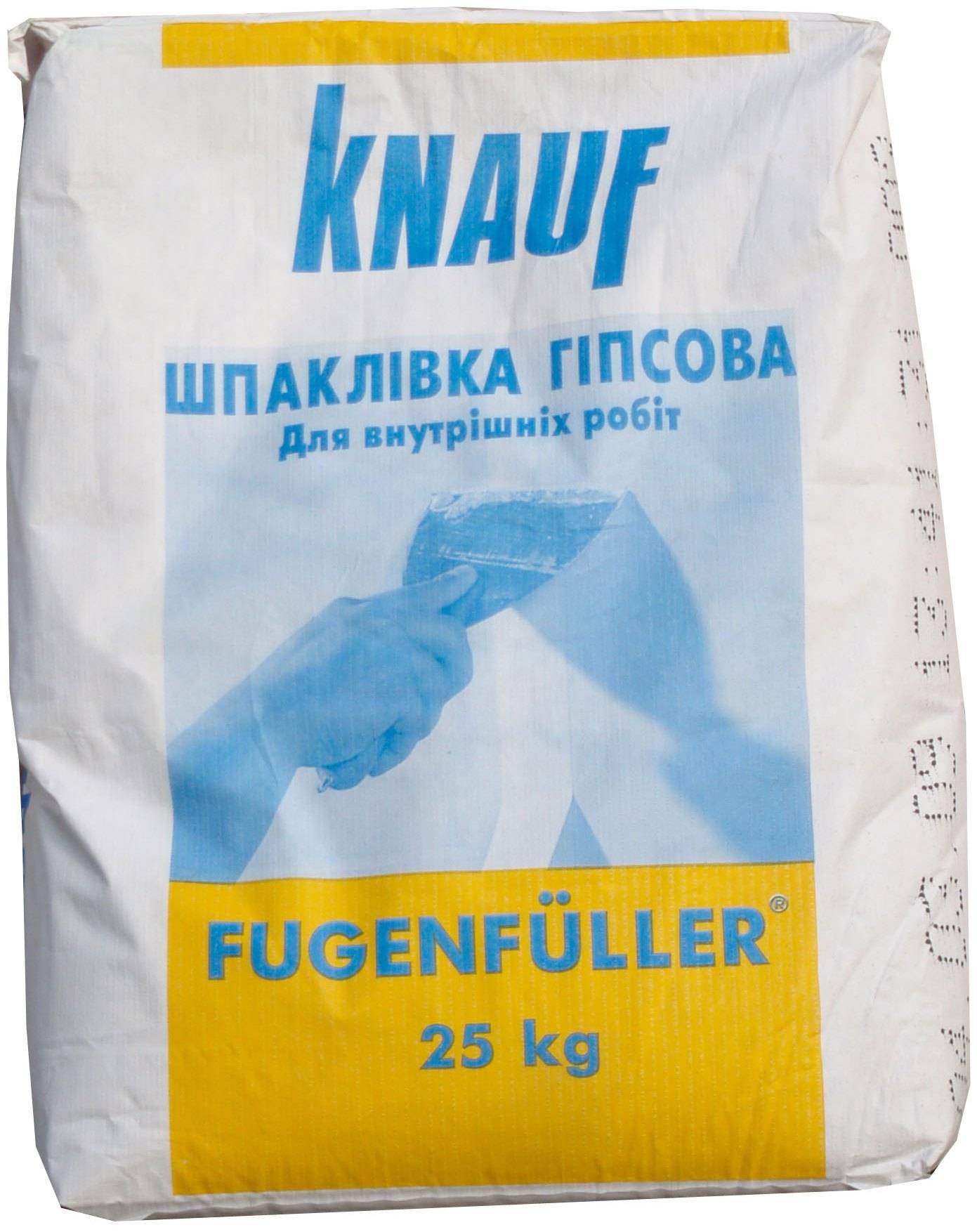 - Используется гипсовая универсальная шпаклевка Фугенфюллер от Кнауф. Она поставляется в 25-килограммовых мешках.