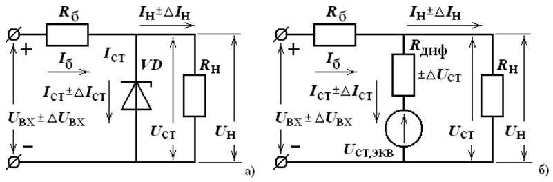 Схема замещения стабилизатора (рис. 8.4.2, б) отражает зависимость UСТ от тока IСТ (рис. 9.4.1) из-за падения напряжения на сопротивлении rДИФ при неизменном UСТ.ЭКВ.