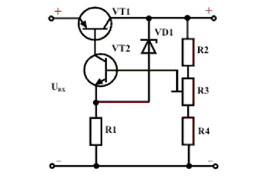 Элемент регулировки выступает в качестве изменяемого сопротивления, подключенного по последовательной схеме с нагрузкой. При колебании напряжения меняется сопротивление элемента регулировки так, что происходит компенсация таких колебаний. Воздействие на элемент регулировки производится по обратной связи, которая содержит элемент управления, источник основного напряжения и измеритель напряжения. Этот измеритель является потенциометром, с которого приходит часть напряжения выхода.