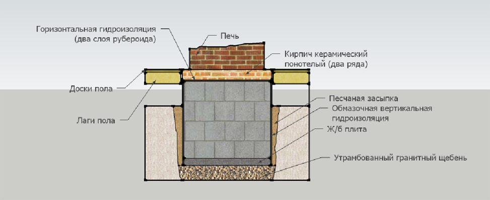 Для первых четырех рядов необходимо использовать только керамический кирпич. Для экономии можно закупить бракованную партию кирпича – все равно, они выполняют роль фундамента для отопительного оборудования. Первый ряд выкладывается боковой стороной кирпича. Дальше основной строительный материал кладется плашмя;