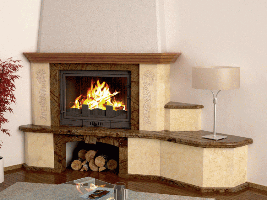 Хорошо подумайте, где будет стоять будущий угловой камин из кирпича. Размеры конструкции должны гармонично вписываться в интерьер или даже влиять на его формирование. Так, вокруг камина можно поставить кресла и журнальный стол, организовать рядом рабочее место или просто постелить теплый ковер. При выборе места определите, где будет проходить дымоход через перекрытия на улицу. Для этого подойдет наружный угол комнаты или внутренний – это дело вкуса и зависит от планировки.