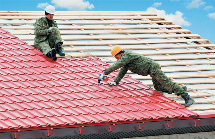 Сначала к карнизным планкам прикрепляют крюки для крепления водостоков. 4 листа металлопрофиля укладывают без закрепления. Прикручивают их после того, как выровняют все стыки. В среднем для этого потребуется до 10 саморезов на каждые 2 кв.м. Теперь можно поставить коньковые накладки.