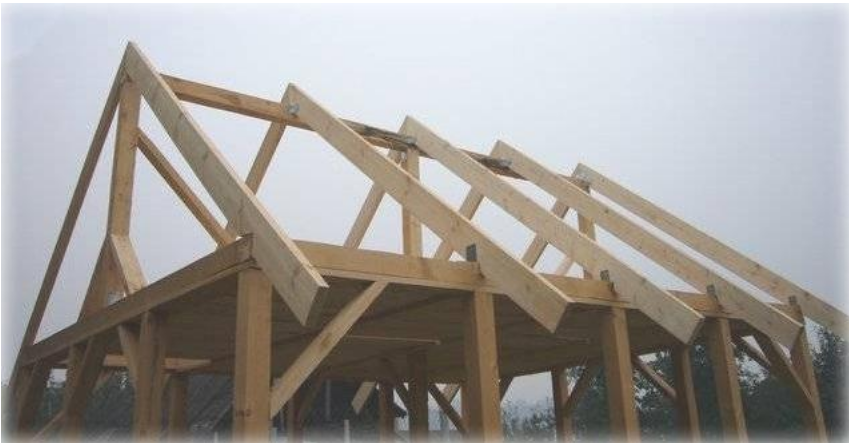 - Конек – это брус 50х200 мм. Его нужно состыковать над опорной конструкцией, чтобы не произошло искривление.