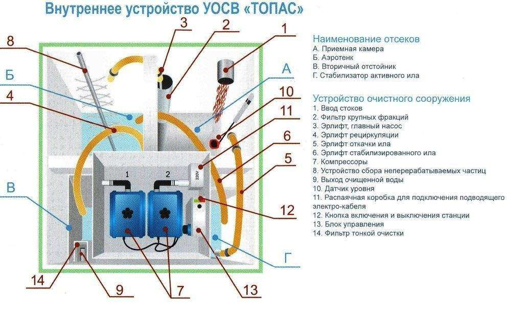 Станция оснащена насосом для передачи жидкости внутри конструкции. Воздух подается компрессором. Вода проходит несколько стадий очистки: