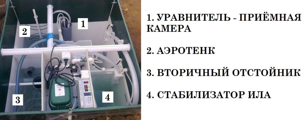 - Стоки поступают в приемный отсек септика (1). Здесь происходит их перемешивание воздухом. Разбиваются крупные фракции. Эту емкость называют еще уравнительным резервуаром, который позволяет принять залповый сброс. В первом отсеке уже начинается процесс очистки за счет аэрации стоков воздухом.