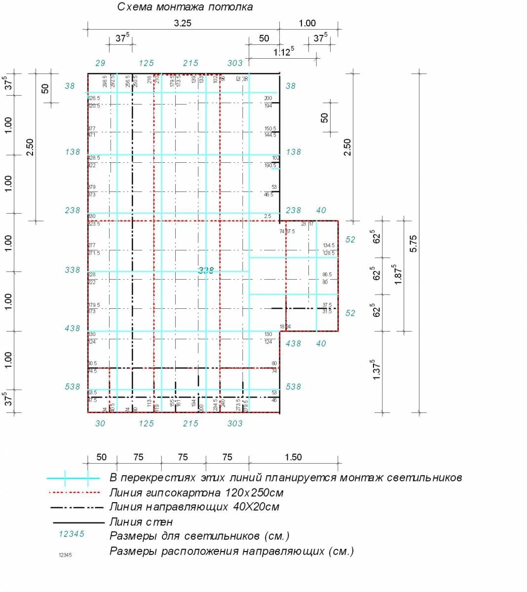 Шаг 8. Схема дополняется точками расположения подвесов (через каждые 40-60 см) и точками, где монтировались светильники и элементы проводки.