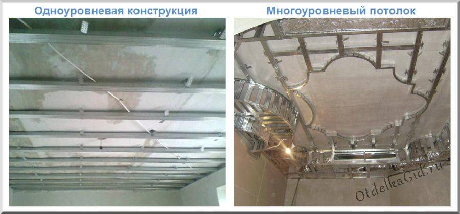 - Многоуровневым. Этот каркас потолка из гипсокартона собирают при обустройстве нескольких ярусов и для создания плавных обводов и сложных фигур. Также с его помощью собирают многоуровневую потолочную конструкцию, где материал обшивки крепят по периметру стен, а в центре размещают натяжное полотно из ткани или поливинилхлорида.